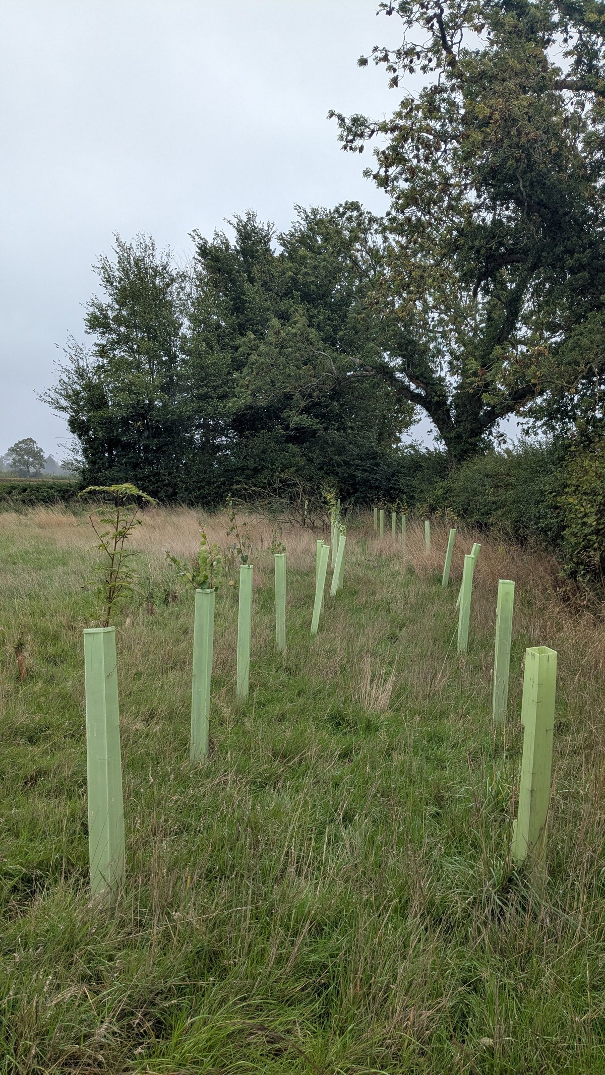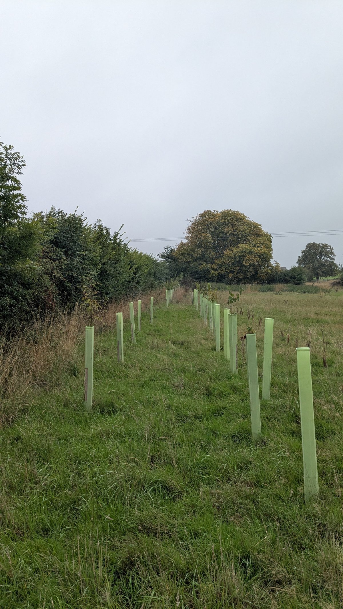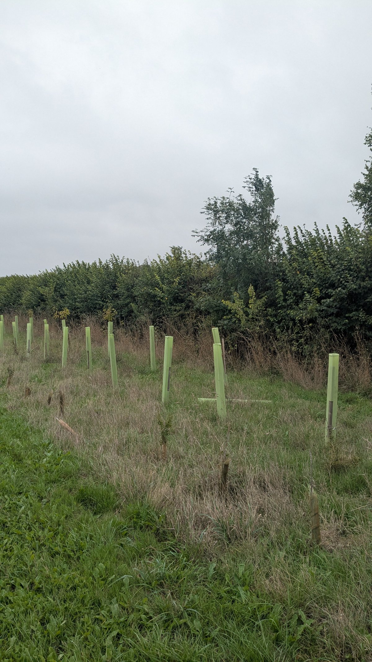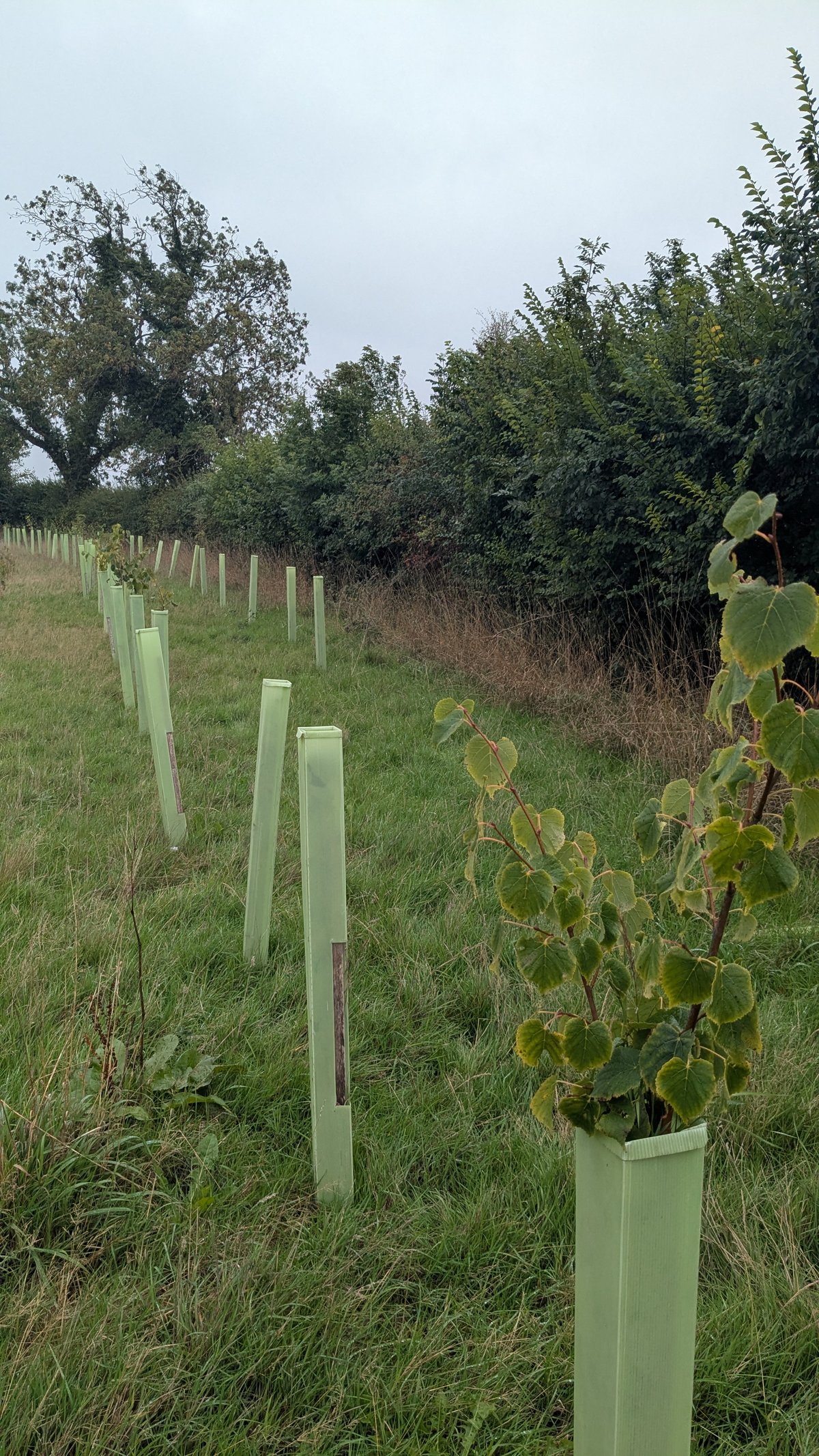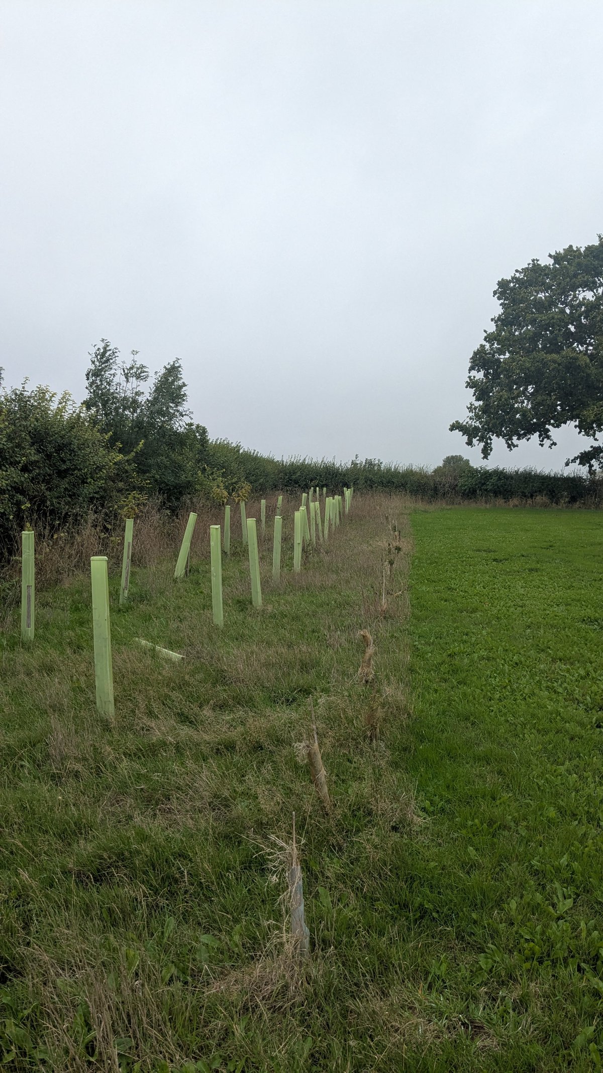 Corporate volunteers from Uddeholm UK helped with this. We also had a group of Vegan Runners from the Bristol area also on the Saturday and some local volunteers on the Sunday. We planted two shelterbelts next to the road to supplement the existing hedgerow.