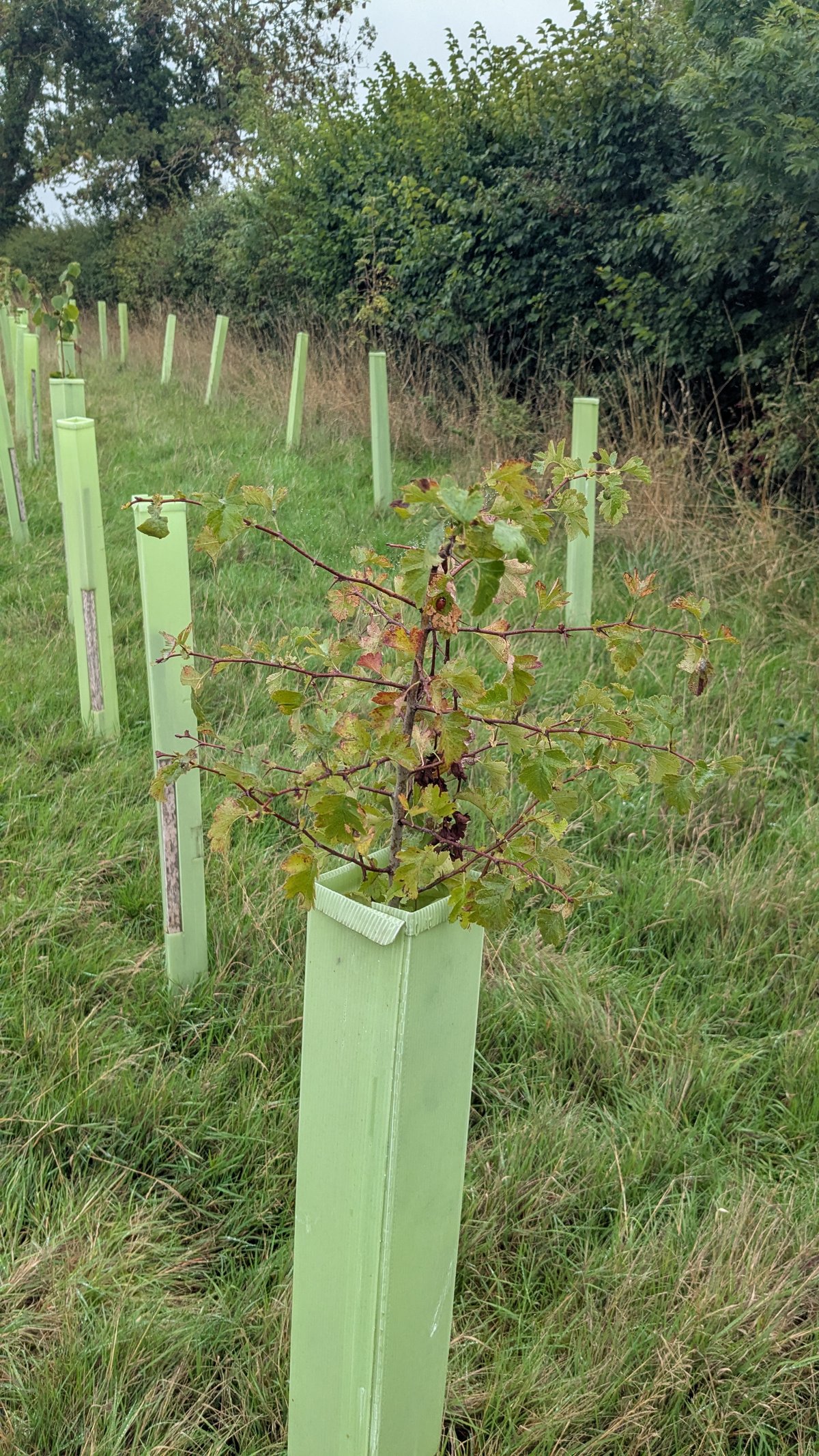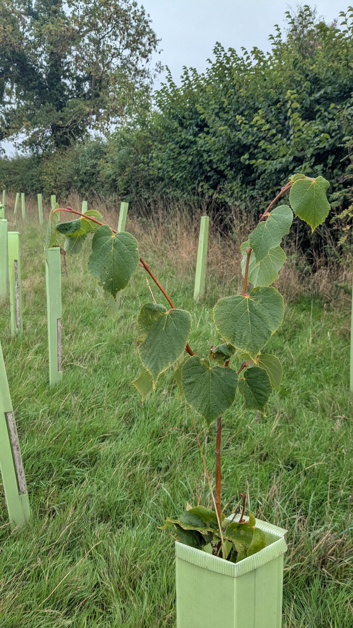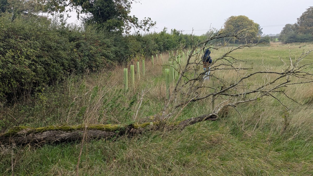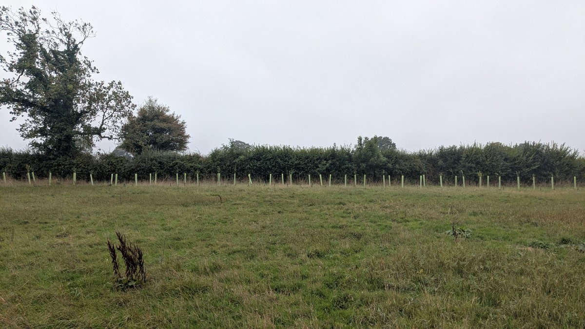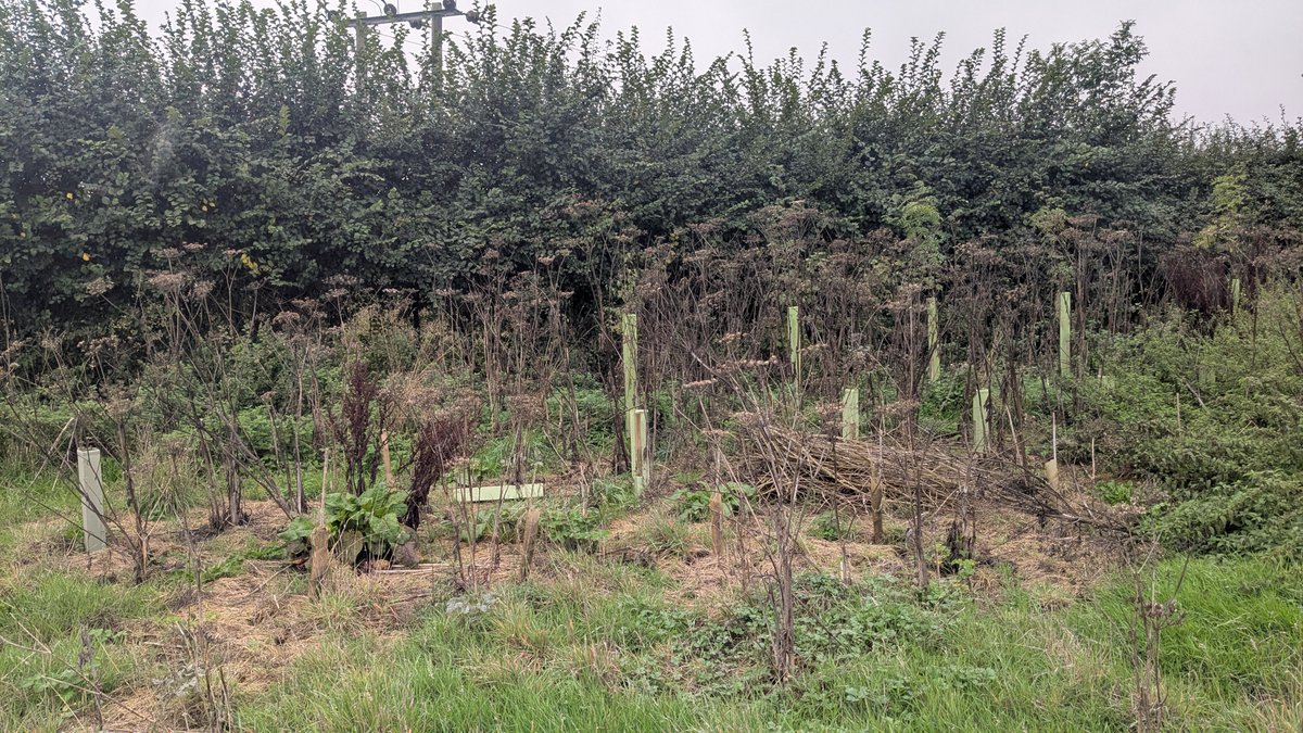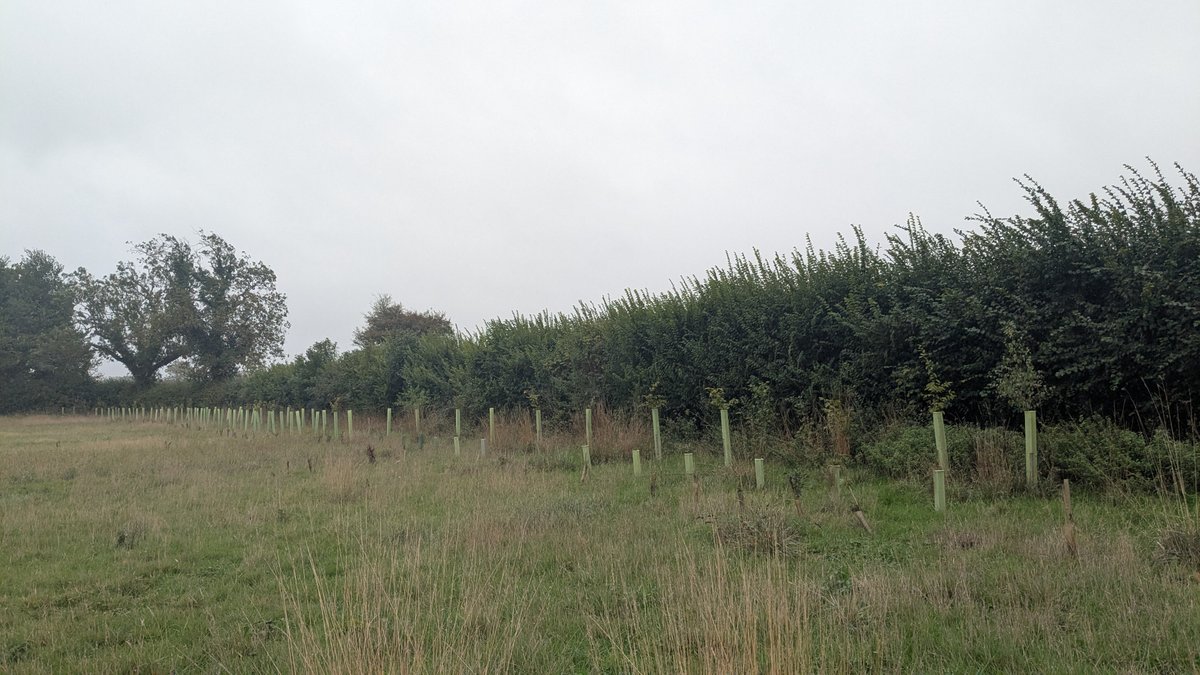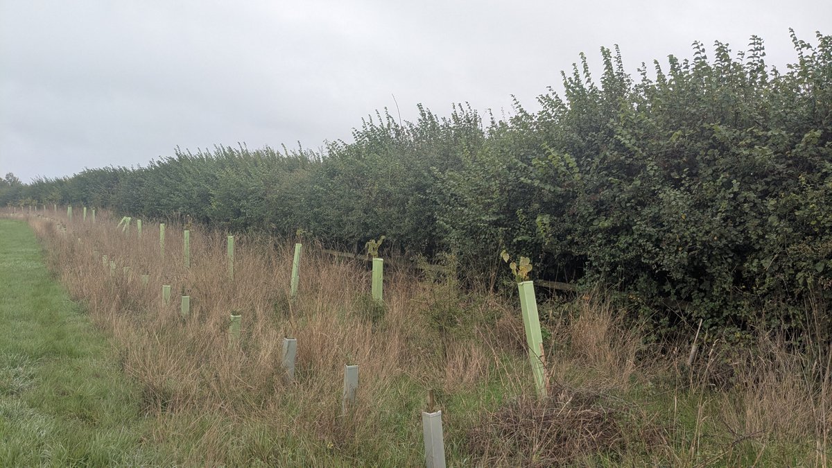Corporate volunteers from Uddeholm UK helped with this. We also had a group of Vegan Runners from the Bristol area also on the Saturday and some local volunteers on the Sunday. We planted two shelterbelts next to the road to supplement the existing hedgerow.