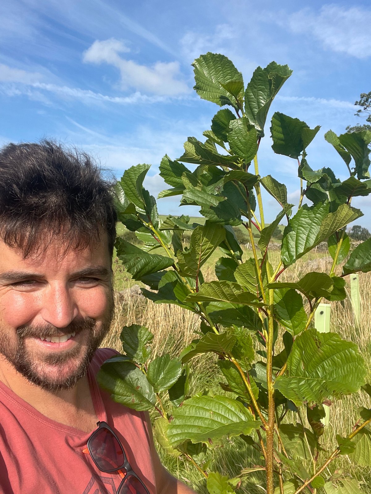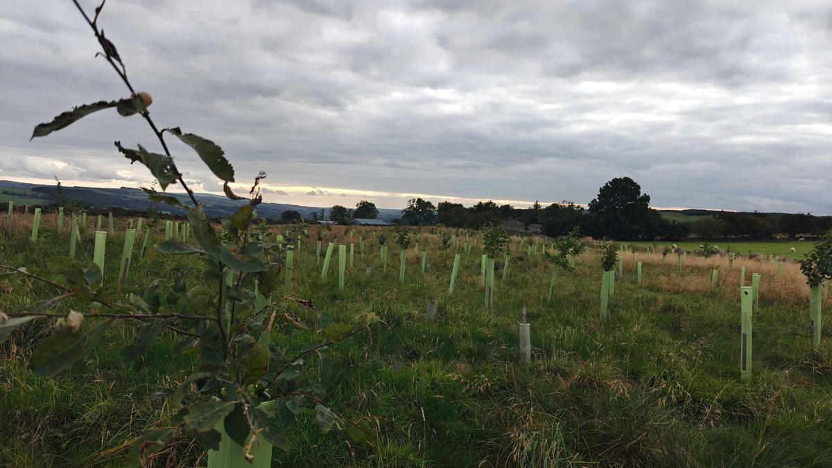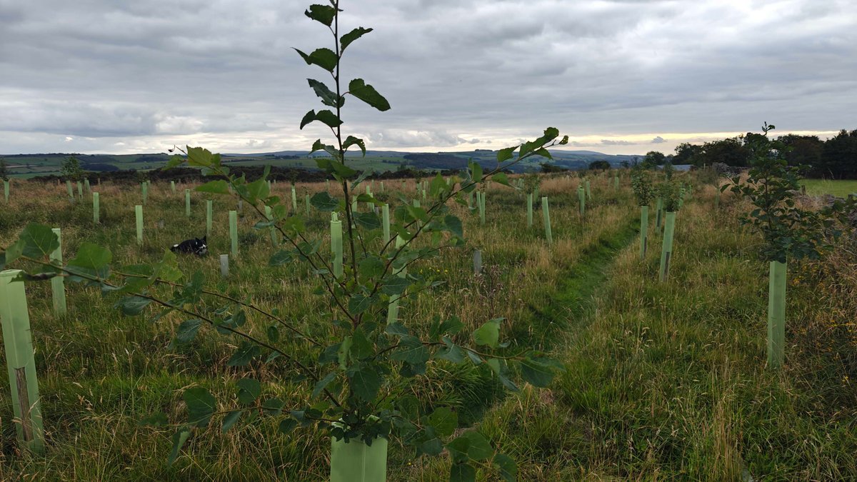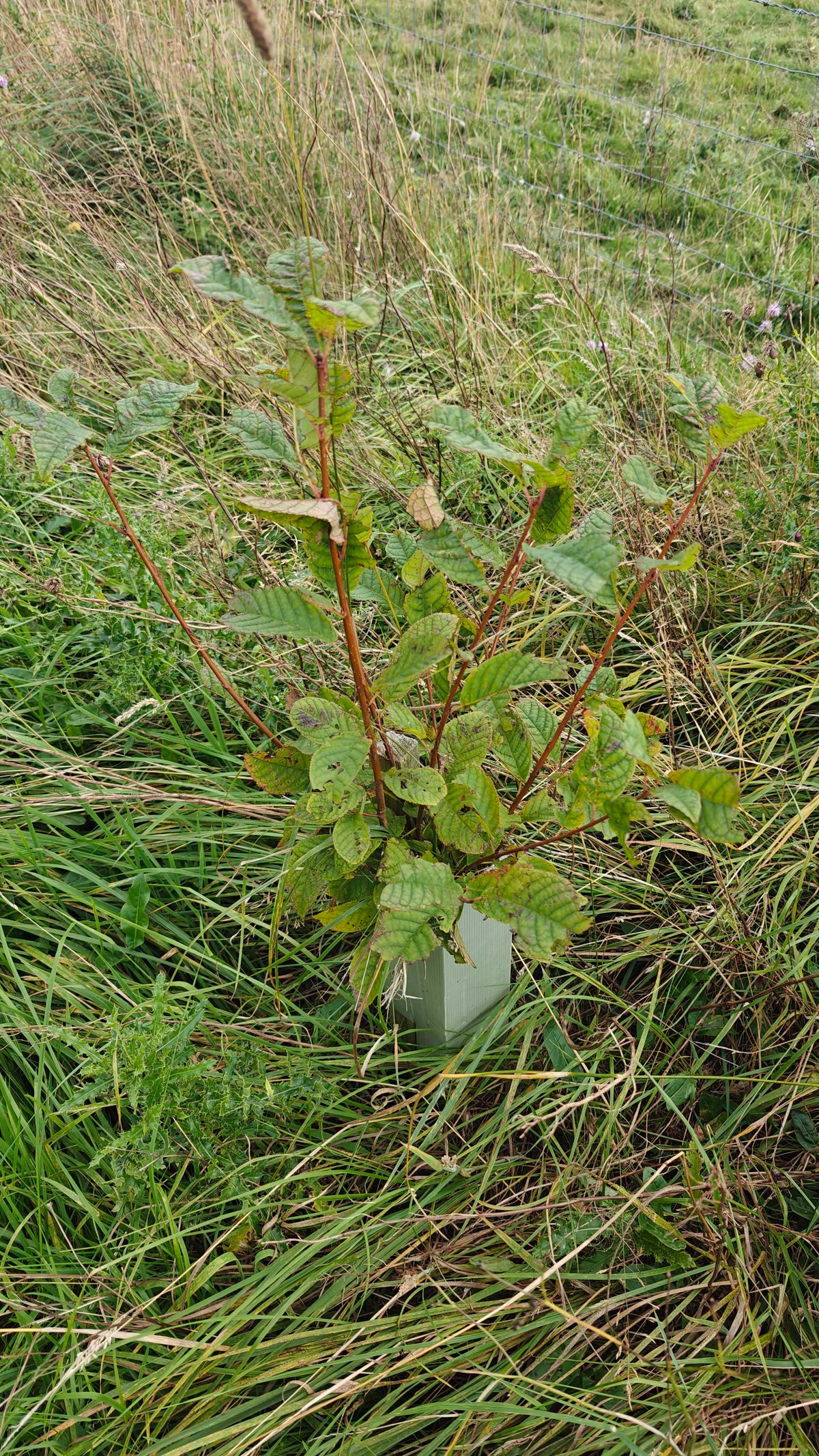 We planted 675 trees and shrubs here on soil with low fertility, mainly loam and clay. There were some small areas of semi-natural ancient woodland nearby so this planting helped to link some of them. Birch, Aspen and Alder were planted in the wetter areas with Sessile Oak, Hazel and other tree species evenly throughout the planting area. Bird Cherry and shrubs were planted mostly at the periphery but with some throughout in clusters. Belts of Alders, Aspen and Rowan were planted around the edges of the woodland as windbreaks.