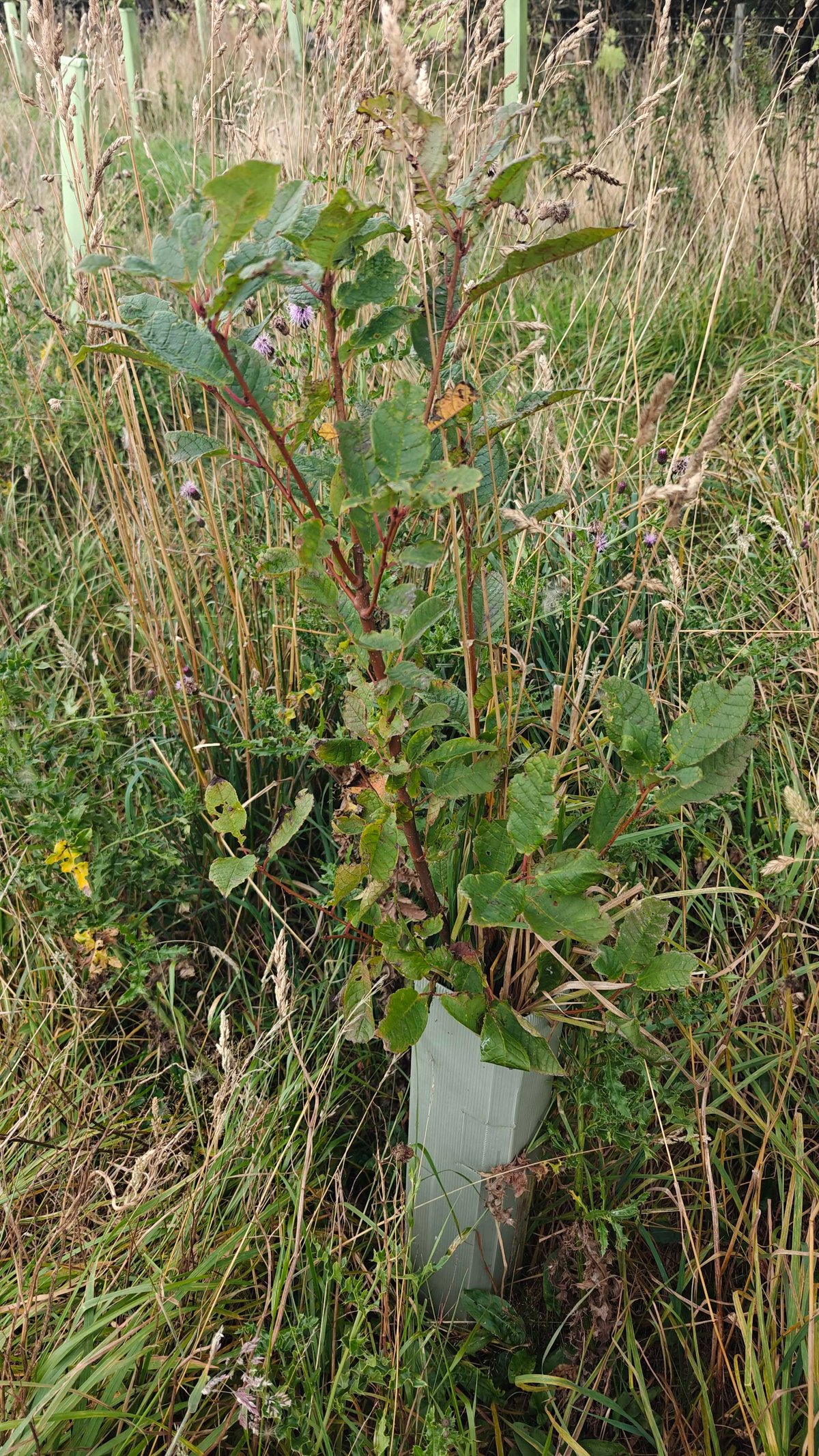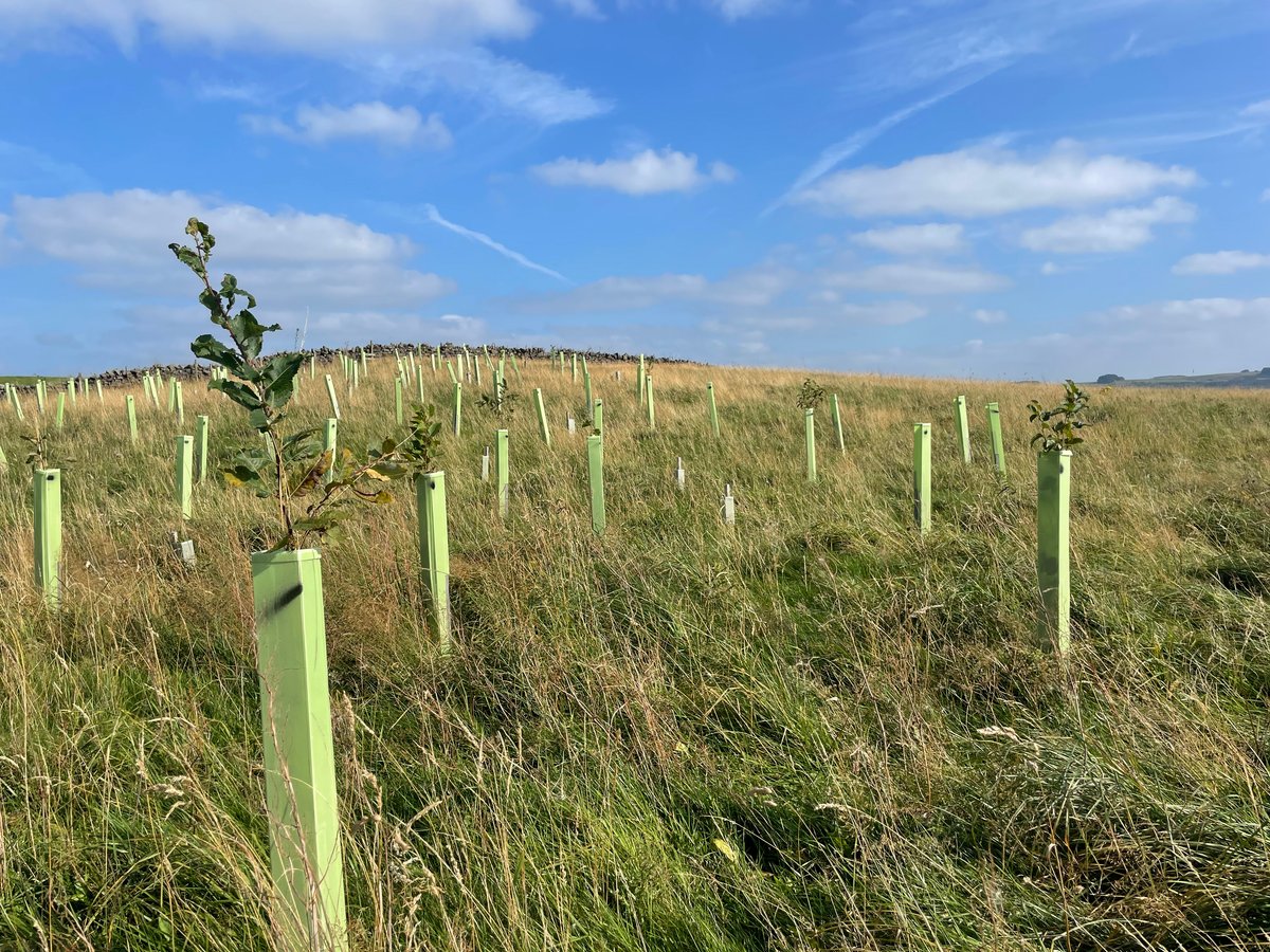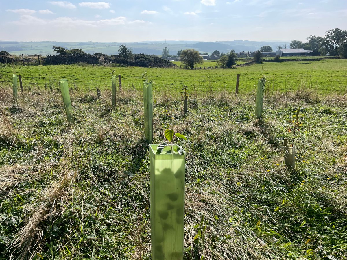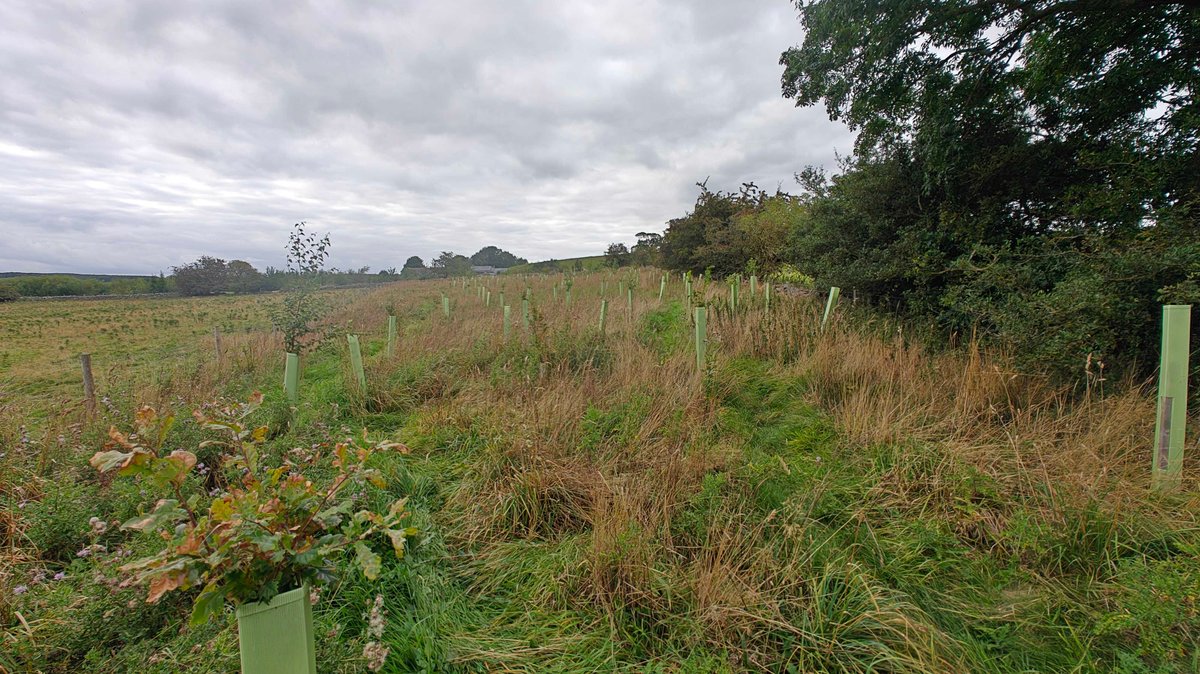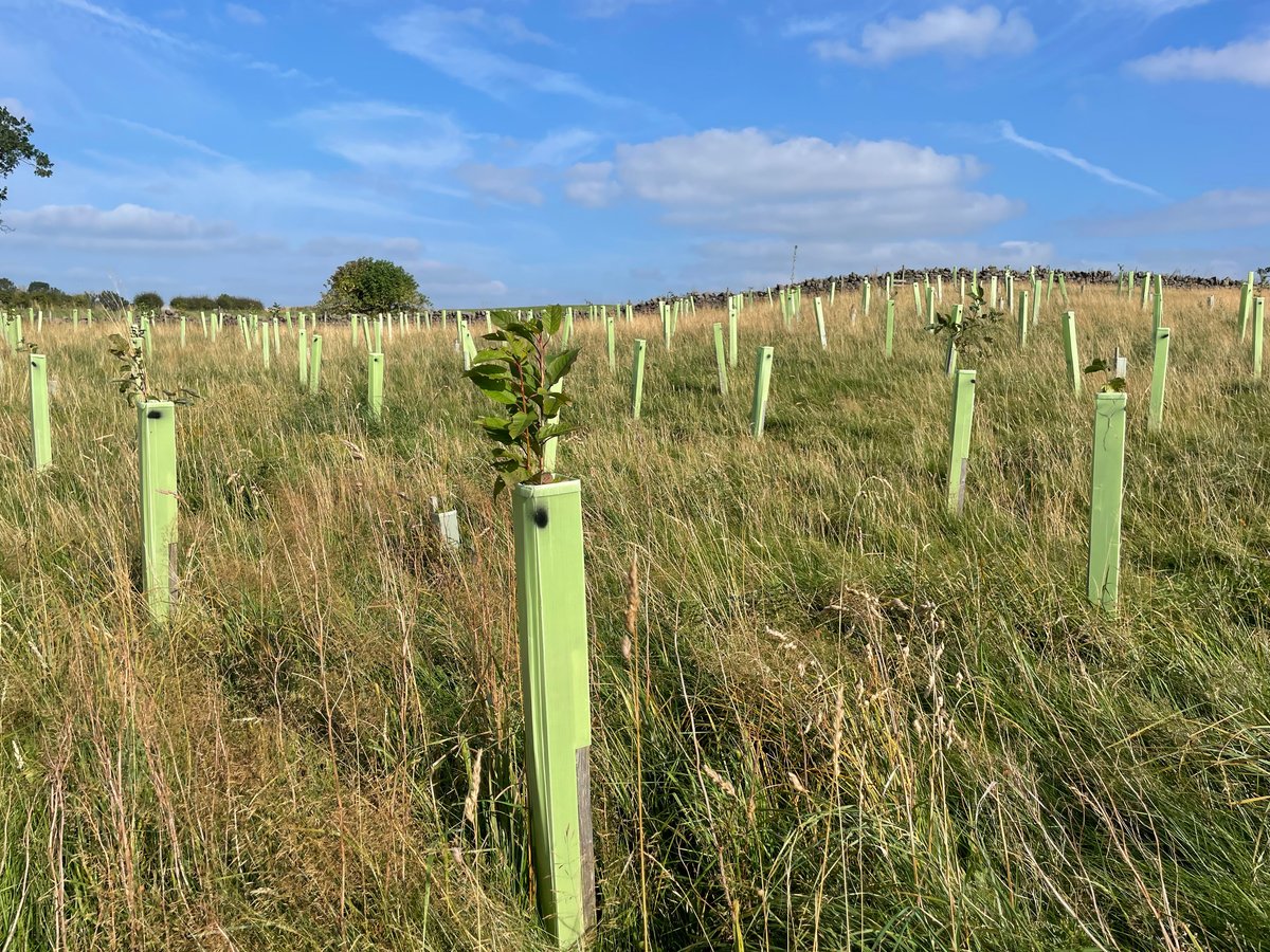 Trees were planted as bare rooted 40-60cm whips and were protected with 1.2m tree tubes and stakes in clusters of the same species, randomly spaced. Shrubs protected with 75cm shrub guards and stakes. Random gaps were left to provide open areas in the woodland.