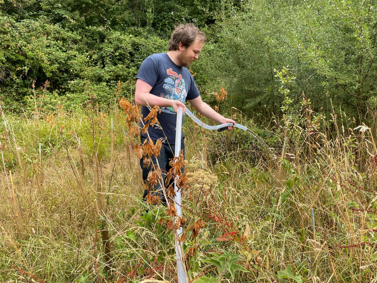The first year of planting is always the most difficult time and the summer 2022 drought was historically bad. Despite being right next to a river the soil was too dry and these saplings were struggling, so we got out there with the landowners pickup truck and a petrol generator to give this young miniforest a chance.