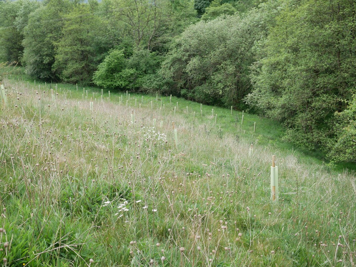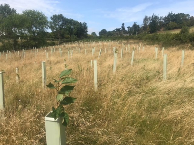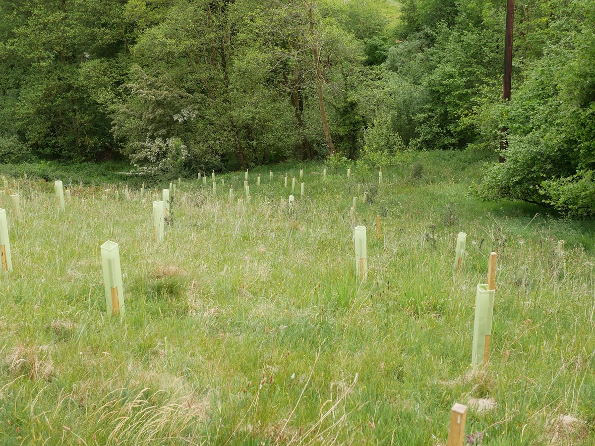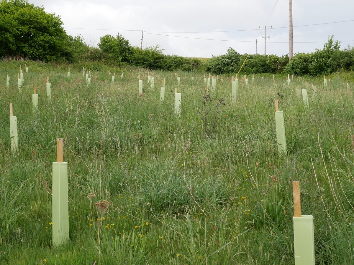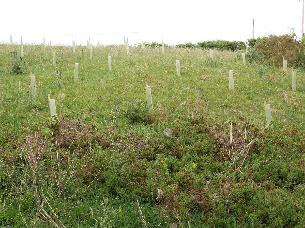 Overall impression - very good. Trees doing well, all shelters vertical - site looks well looked after. 92% survival rate. The Landowner said We have seen hares, lots of mice and also a big deer possibly roe - certainly bigger than muntjac and we have found antlers! The newer trees are virtually 100% fine, so far. The older ones have suffered though, with roughly 15% dead to date. There are lots of trees popping up naturally and doing very well without any assistance from humans. Alder is doing very well in the wetter areas (some over a metre tall), and there are some small oak saplings dotted about. Hawthorn is spreading like mad - no need to plant any more of those!I In May and June we have done a little maintenance, straightening posts that were leaning over, removing grass/weeds from tubes etc.