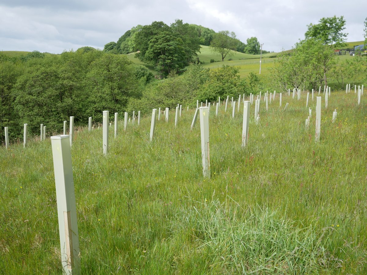 The landowner here own 10 acres, which is currently sheep grazed pasture. The objective is to improve the site for biodiversity by planting a mix of native tree and shrub species including Oak, Wild Cherry, Rowan and Birch. The new planting will incorporate gaps, glades and include shrub species to give the woodland a diverse and natural structure.