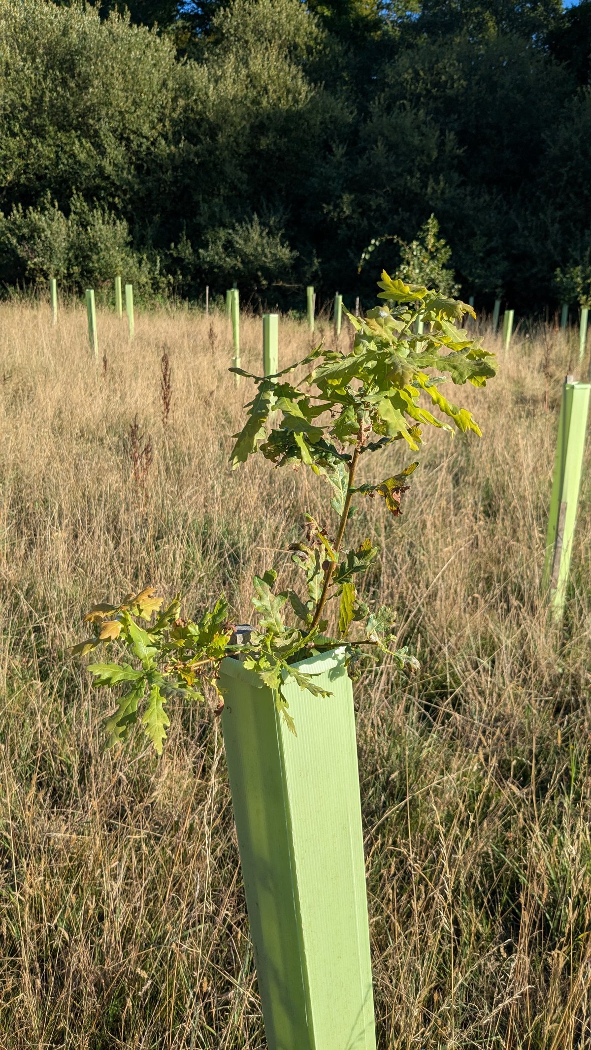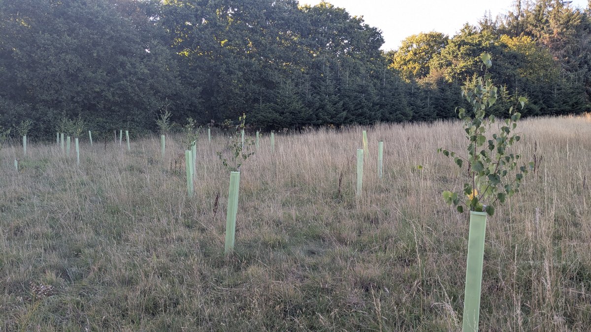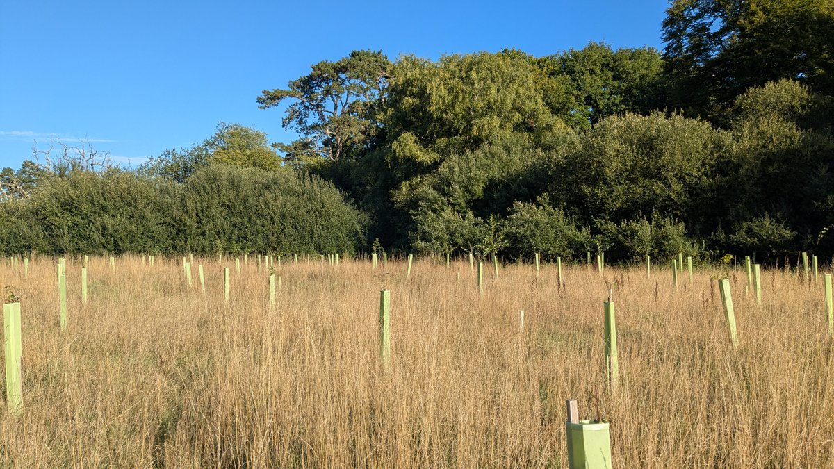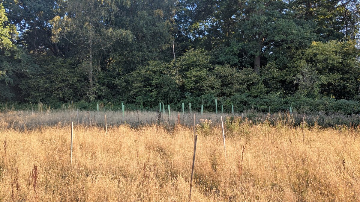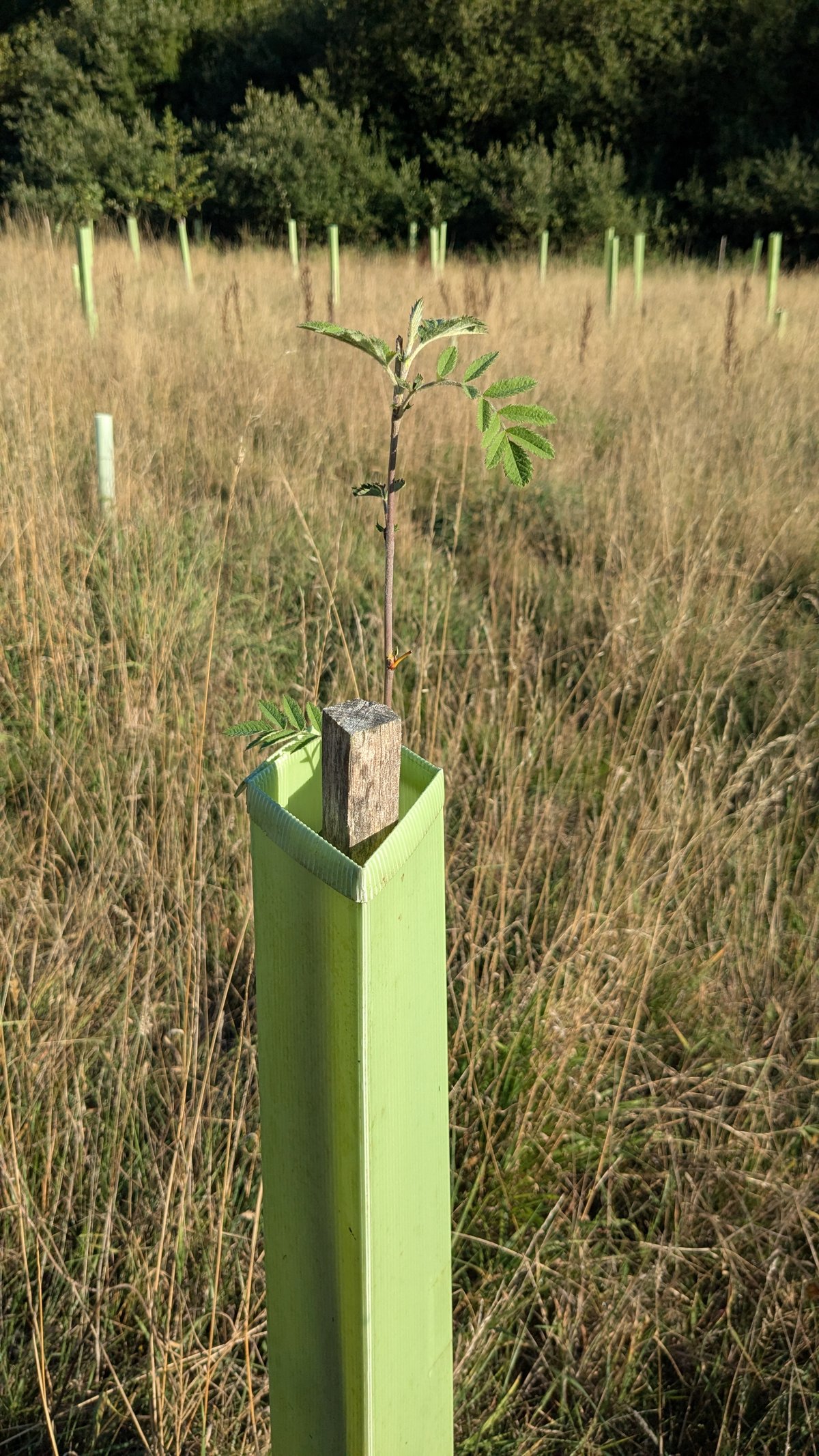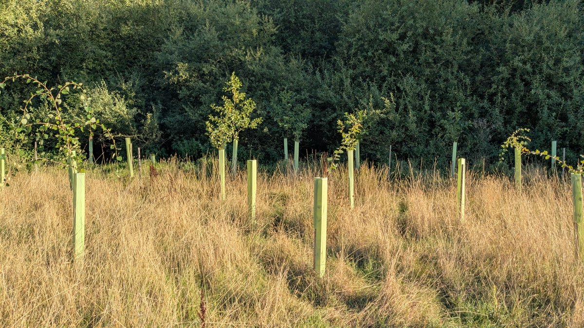 Trees were planted as bare rooted 40-60cm whips and were protected with 1.2m tree tubes and stakes in clusters of the same species, randomly spaced. Shrubs protected with 75cm shrub guards and stakes. Random gaps were left to provide open areas in the woodland.