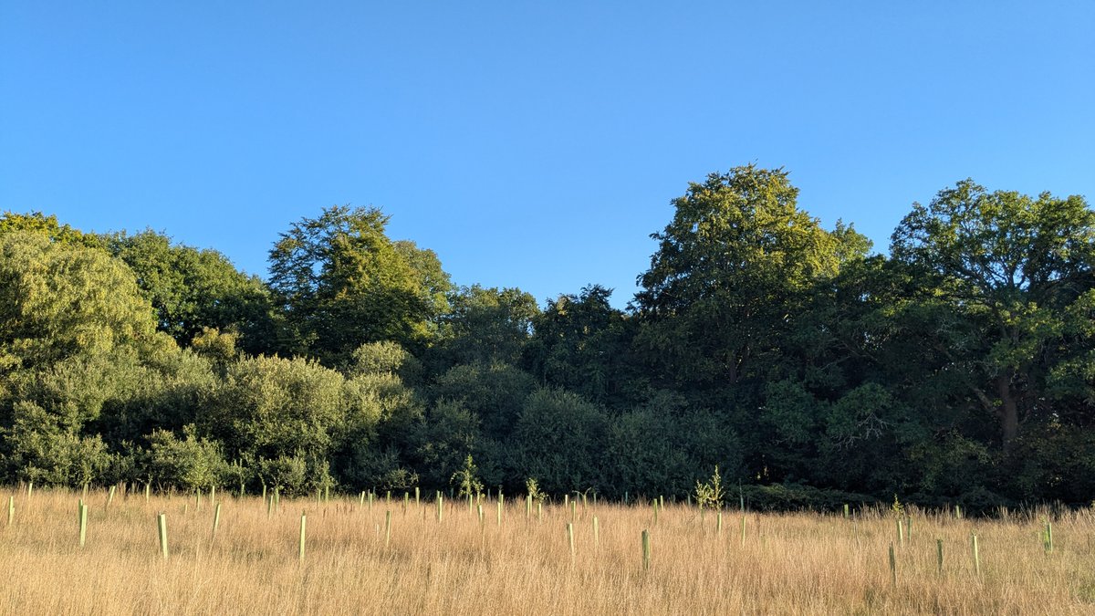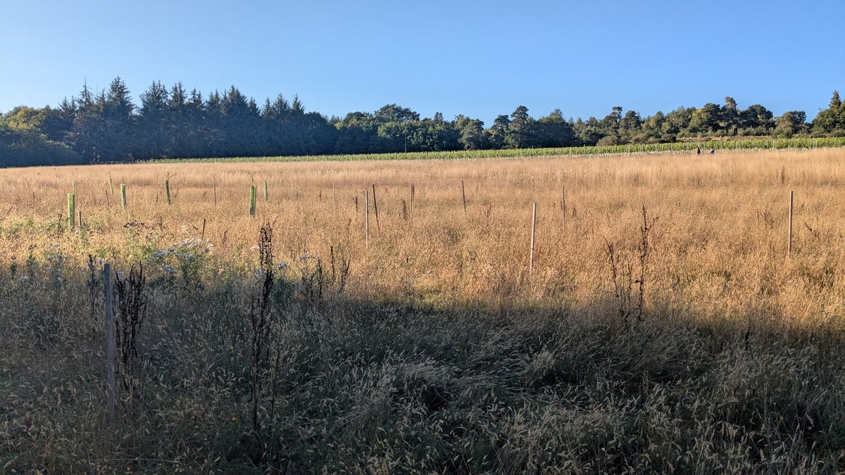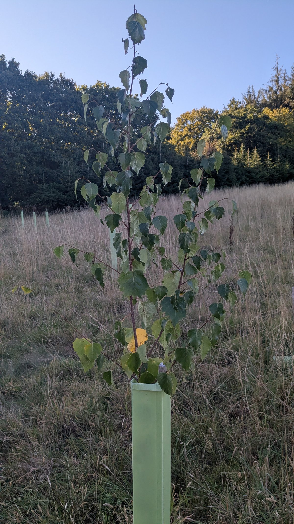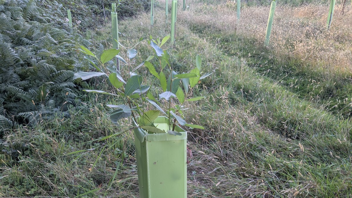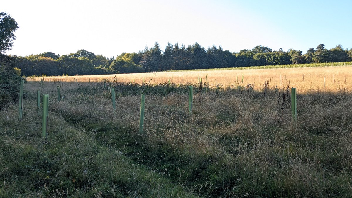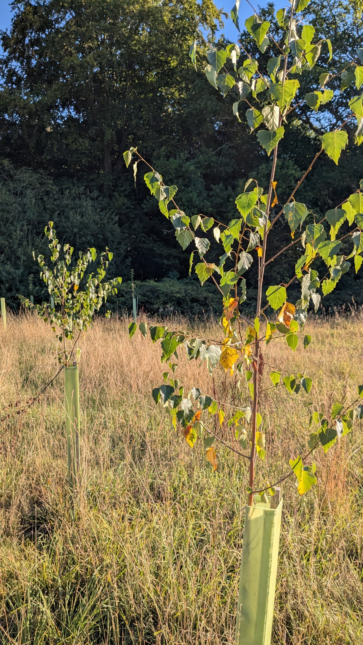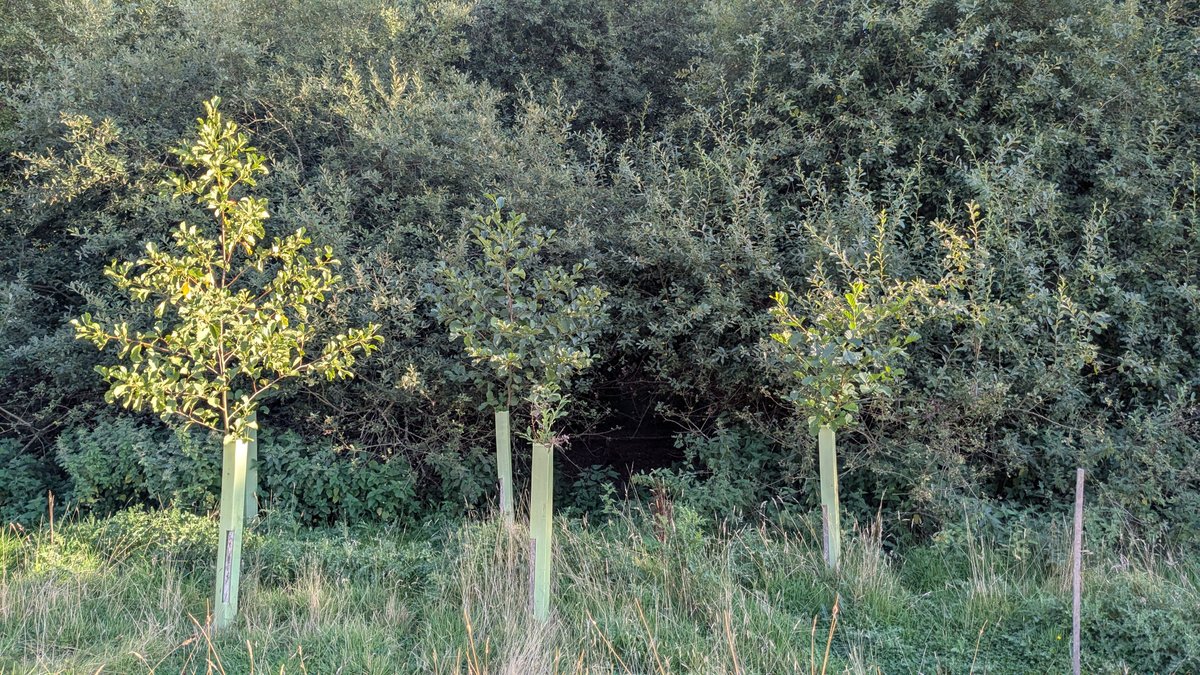Trees were planted as bare rooted 40-60cm whips and were protected with 1.2m tree tubes and stakes in clusters of the same species, randomly spaced. Shrubs protected with 75cm shrub guards and stakes. Random gaps were left to provide open areas in the woodland.